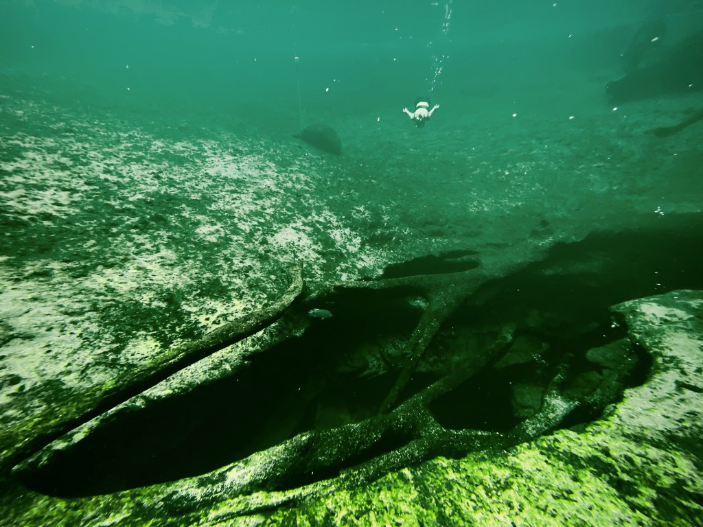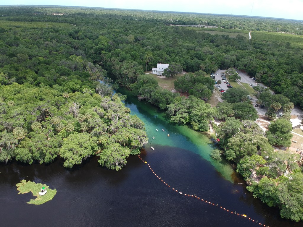 Blue Spring is an aquatic cave connecting the Florida aquifer with the surface, with an old fallen tree guarding the entrance. The cave has been mapped down 125 feet into the earth, and an average of 87 million gallons of fresh water flows out from the spring and into the St. John’s river, daily.