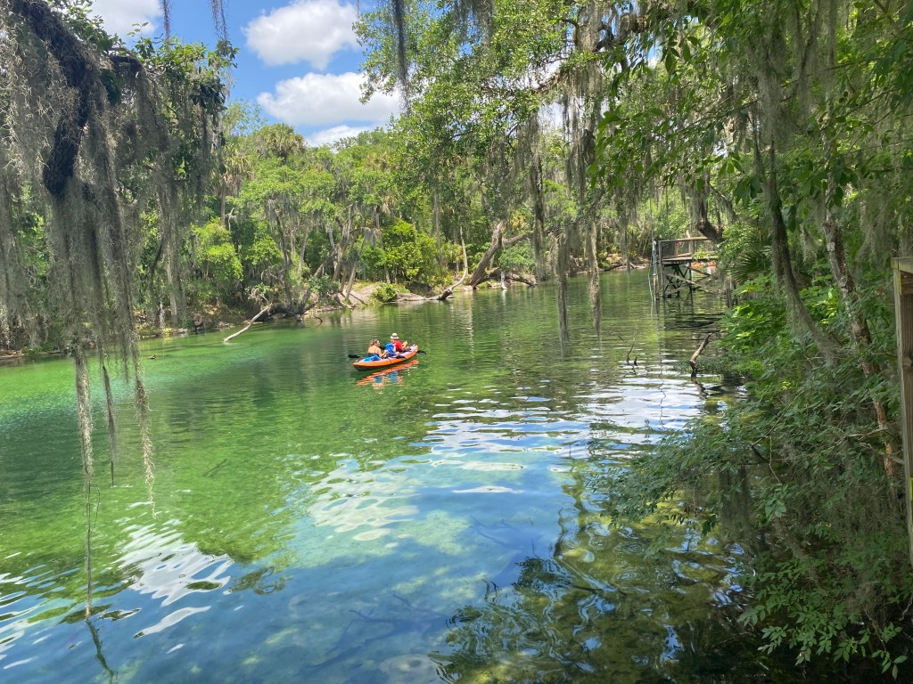 Plantaina is a young manatee living thanks to the work of Disney’s The Seas with Nemo and Friends at EPCOT and manatee rescue group volunteers. At Blue Spring State Park, a volunteer on a kayak tasked with watching and protecting Plantaina told us her story. Rescued in Dade County as an abandoned baby, Plantaina was first released in an area of the Everglades. She began losing weight rapidly and was brought back to rehabilitation, this time at Disney. This release to Blue Spring in February 2021 is thus the second attempt to reintroduce her to the wild.